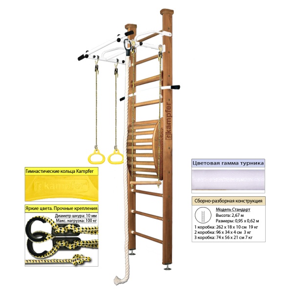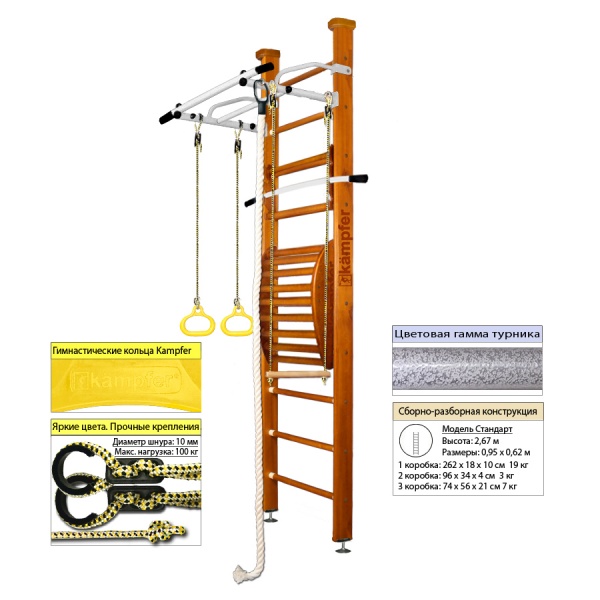 Уникальность конструкции "шведки" в том, что она может комплектоваться разными спортивными снарядами – это брусья, кольца, канаты и веревочные лестницы. Сбоку можно повесить боксерский мешок, закрепить навесной туник или баскетбольный щит. В итоге, на ограниченном по размерам пространстве ребенок получает всё необходимое для полноценных занятий спортом. В каталоге Kampfer представлен широкий выбор дополнительных аксессуаров, которые обеспечат комфорт.